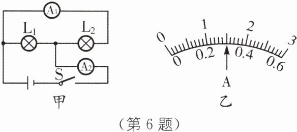 6 如图甲所示的电路中,闭合开关,两灯泡均发光,且两个完全相同的电流表的指针偏转均如图乙所示,则通过灯泡$L_1$和$L_2$的电流分别为( ).