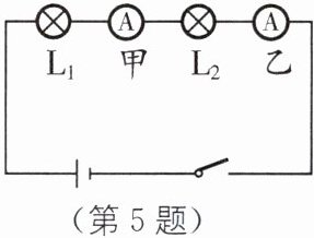 5 连接如图所示电路,研究串联电路中电流的特点.实验时电流表甲和乙的示数分别为0.18 A和0.16 A,造成两个电流表示数不同的原因可能是( ).