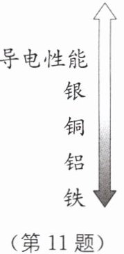 11 如图所示是银、铜、铝、铁四种材料导电性能的排序,从上至下,材料的导电性能依次减弱.由此可以判断( ).(不考虑温度对电阻的影响)