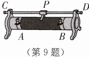 9 如图所示是实验室常用的滑动变阻器,它的铭牌上标有"20Ω 1 A"字样,表示此变阻器电阻的变化范围是______Ω,当把A、D连入电路,欲使电路中的电流增大,须将滑片P向______(填"A"或"B")端移动.