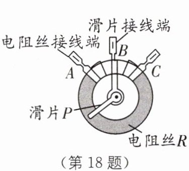 18 新情境 电位器结构分析 如图所示为某台灯用于调节亮度的电位器结构图,A、B、C是它的三个接线柱,A、C分别与弧形电阻丝的两端相连,B与金属滑片P相连,转动旋钮,滑片在弧形电阻丝上滑动即可调节灯泡亮度.下列分析正确的是( ).