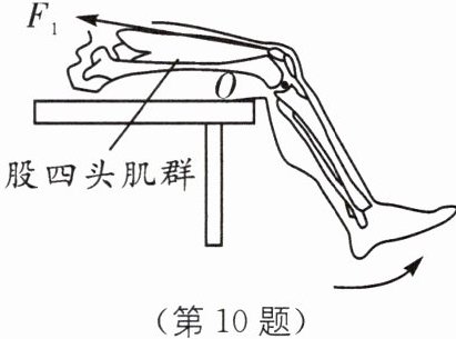 10 (2024·扬州中考)如图所示,小明坐在座椅上,伸小腿时,小腿绕膝关节上固定点 O 转动,股四头肌群收缩提供动力$ F_1.$