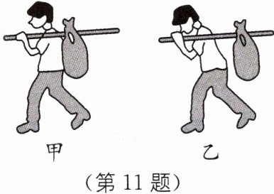 11 如图甲、乙所示,是某人分别用两种方式挑着同一物体行走时的情景,小强看后感到疑惑:改变物体的位置,人用的力更大了吗? 于是想用实验的方法一探究竟.他要探究的问题是在杠杆平衡的情况下( ).