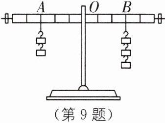9. C [解析]根据杠杆的平衡条件$F_{1}l_{1}=F_{2}l_{2}$分析判断,设一个钩码重力为G,一个格的长度为l,根据杠杆平衡条件可得,将A处的钩码向右移动一格,则有$2G×2l<3G×3l$,杠杆不能平衡,故A错误;将A处的钩码向左移动一格,则有$2G×4l<3G×3l$,杠杆不能平衡,故B错误;将B处的钩码向左移动一格,则有$2G×3l=3G×2l$,杠杆能平衡,故C正确;将B处的钩码向右移动一格,则有$2G×3l<3G×4l$,杠杆不能平衡,故D错误.