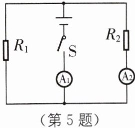 5 如图所示,电阻$R_{1}$、$R_{2}$的阻值之比为2:1,当开关S闭合时,电阻$R_{1}与R_{2}$两端的电压之比为______,电流表$A_{1}与A_{2}$的示数之比为______.