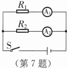 7 在其他条件相同的情况下,电阻较小的导体,其材料的导电性能较强.如图所示的电路中,$R_{1}$是甲种材料制成的电阻丝,$R_{2}$是乙种材料制成的电阻丝,它们的长度相等,$R_{1}$、$R_{2}的横截面积分别为S_{1}$、$S_{2}$,且$S_{1}<S_{2}$.闭合开关S后,观察到电流表$A_{1}的示数I_{1}大于电流表A_{2}的示数I_{2}$.则下列说法中正确的是( ).