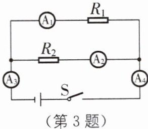 3 如图所示的电路中,电流表规格都相同,电阻阻值$R_{1}= R_{2}$.开关S闭合后,电流表$A_{2}$的示数为0.5 A.下列判断正确的是( ).