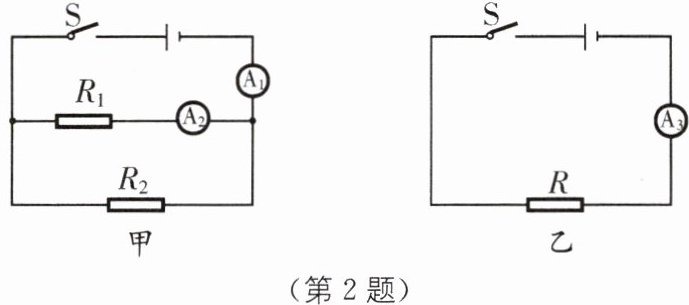 2 如图甲、乙所示电路的电源电压相等且不变,若电流表$A_{1}$、$A_{3}$的示数相等,则电阻$R$、$R_{1}$、$R_{2}$的大小关系正确的是( ).