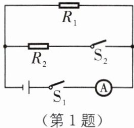 1(2024·武汉模拟)如图所示的电路中,电源电压保持不变,$R_{1}和R_{2}$为两个定值电阻,$R_{1}= 10\ \Omega$,当开关$S_{1}$、$S_{2}$均闭合时,电流表示数为0.5 A,然后只将开关$S_{2}$断开,电流表示数减小了0.2 A.电阻$R_{2}$的阻值为( ).