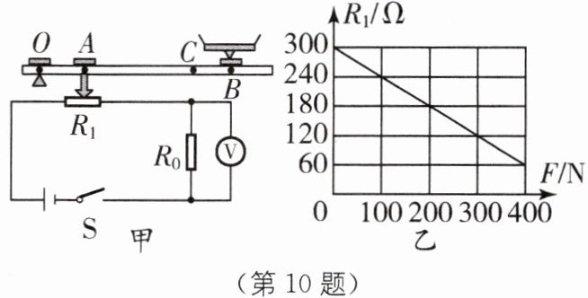 10 (2024·泰州海陵区一模)在课外实践制作活动中,小红将量程为0~3 V的电压表改装成一个测量质量的电子秤,电路如图甲所示.电源电压恒为6 V,电阻$R_{0}$为60 Ω,压敏电阻$R_{1}$的阻值随压力变化如图乙所示.O点是杠杆OAB的支点,托盘固定在B点,$AO:BO= 1:4$,托盘及杠杆组件的质量忽略不计,g取$10N/kg$.