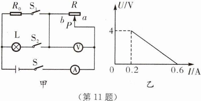 11 在如图甲所示的电路中,$R_{0}$为定值电阻,R为滑动变阻器,电源电压保持不变.只闭合开关S和$S_{1}$,将滑动变阻器的滑片P从a端移动至b端的过程中,电流表示数I与电压表示数U的变化关系如图乙所示.闭合开关S、$S_{1}和S_{2}$,将滑动变阻器的滑片P移到b端时小灯泡正常发光,此时电流表的示数为0.8 A.求: