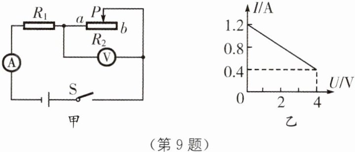 9 如图甲所示的电路中,$R_{1}$为定值电阻,$R_{2}$为滑动变阻器,电源电压不变.闭合开关S后,滑片P从a端移动到b端,电流表示数I与电压表示数U的变化关系如图乙所示,则电源电压为 V,$R_{1}$的阻值为 Ω.