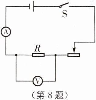 8 如图所示,电源电压为9 V,定值电阻R为10 Ω,滑动变阻器的最大阻值为50 Ω,电流表量程是0~0.6 A,电压表量程是0~3 V,为了保证电路中所有元件安全,滑动变阻器的阻值变化范围只能为 .