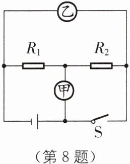 8 在如图所示电路中,电源电压恒定.若甲、乙两表都是电压表时,当开关S闭合,两表的示数$U_{甲}:U_{乙}= 2:3$,则$R_{1}:R_{2}= $______;若甲、乙两表都是电流表时,当开关S断开时,两表的示数$I_{甲}:I_{乙}= $______.