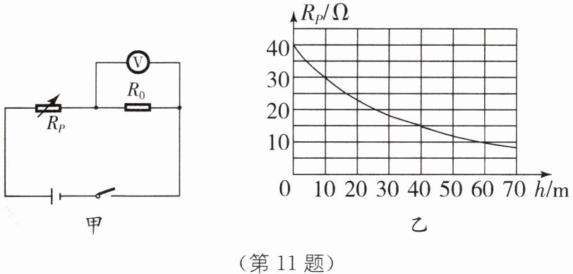 11 随着经济的发展,我国出现了越来越多的潜水爱好者.为了保障潜水时的安全,潜水员潜水时会戴水压表和深度表.如图甲所示是一款深度表的简化电路图,电源电压$U= 6V$且恒定不变,定值电阻$R_{0}= 15\Omega $,$R_{P}$是压敏电阻,图乙是$R_{P}$的阻值随海水深度变化的图像,$R_{P}$允许通过的最大电流为0.24 A.深度表由电压表(量程0~3 V)改装.求: