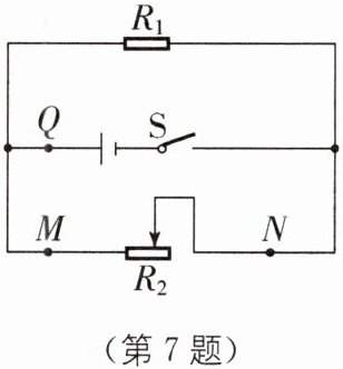 7 如图所示电路中,电路发生了故障.若电路中仅有一处故障,且只发生在电阻$R_1、$$R_2$上.当将电流表串联接入Q点,闭合开关后电流表示数为0.3 A,当向左滑动变阻器的滑片P时,电流表的示数不变,则故障为( ).