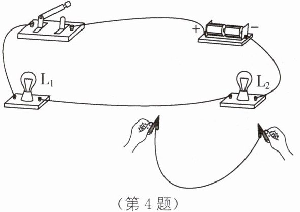 4 如图所示电路中,闭合开关后,发现灯泡$L_1$和$L_2$均不发光,为了检查电路故障,用一根导线接在$L_2$两端时,两灯仍不发光;当将导线接在$L_1$两端时$,L_2$灯发光,由此可以判断电路的故障为______.