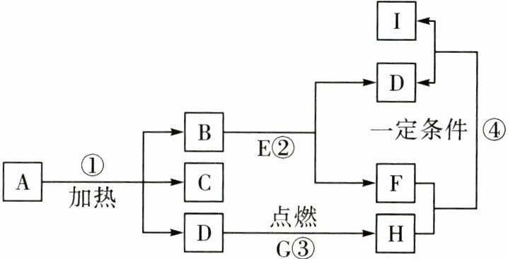 20.(12分)A、B、C、D、E、F、G、H、I九种物质有如图所示关系,“$\longrightarrow$”表示可以向箭头所指方向转化,通常情况下F是一种无色液体,G是一种黑色固体,H是一种能使澄清石灰水变浑浊的气体,在反应②的前后,B的质量和化学性质都不改变。反应④为自然界中很普遍的化学反应。