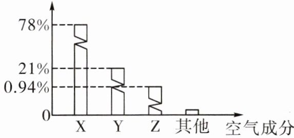 D [解析]按体积分数计算,氮气约占空气体积的78%,氧气约占空气体积的21%,稀有气体约占空气体积的0.94%,故纵坐标表示体积分数,而不是质量分数,A错误;X约占空气体积的78%,因此X是氮气,Y约占空气体积的21%,因此Y是氧气,B错误;Z约占空气体积的0.94%,因此Z是稀有气体,稀有气体包含氖气、氦气等多种物质,属于混合物,C错误;Y约占空气体积的21%,因此Y是氧气,氧气可供给呼吸,可用于登山、潜水,D正确。