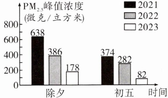 (3)如图所示是某市近三年除夕夜和正月初五的PM_{2.5}峰值浓度,从图中可知,从2021年到2023年,每年春节期间空气质量的变化趋势是