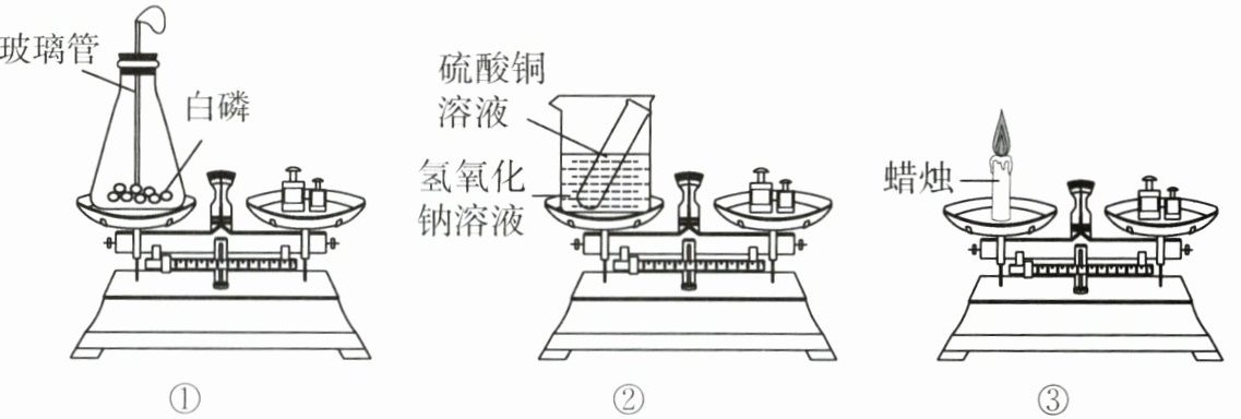 D [解析]实验①白磷燃烧生成五氧化二磷,在密闭装置中进行,可以验证质量守恒定律;实验②氢氧化钠与硫酸铜反应生成氢氧化铜沉淀与硫酸钠,发生了化学变化,没有气体生成可以验证质量守恒定律;实验③蜡烛燃烧生成二氧化碳与水,有气体参加反应、生成,故必须在密闭的环境下进行实验才能验证质量守恒定律。由分析可知,实验③不能验证质量定律,A正确;由分析可知,该反应放热,若装置未冷却至室温,气球膨胀,产生浮力,会导致质量偏小,指针向右偏转,B正确;实验②无气体参加、生成,且符合质量守恒定律,故实验②反应前后天平始终保持平衡,C正确;实验③蜡烛燃烧消耗氧气,生成二氧化碳和水,根据反应前后物质的总质量不变,则固体减少的质量为释放到空气中的水蒸气与二氧化碳的质量总和减去消耗的氧气的质量,D错误。