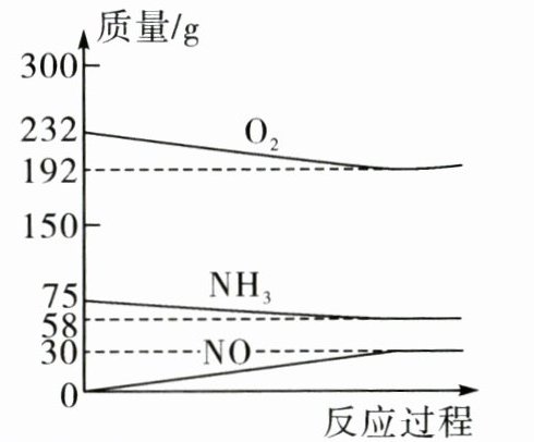 14. 工业上可用“氨氧化法”生产NO,反应原理为$aNH_{3} + bO_{2}\xlongequal{催化剂}cNO + dX$。兴趣小组模拟生产NO,在一密闭容器中充入一定量的$NH_{3}和O_{2}$充分反应,反应中部分物质的质量随反应过程的变化如图所示。下列说法错误的是( )。
