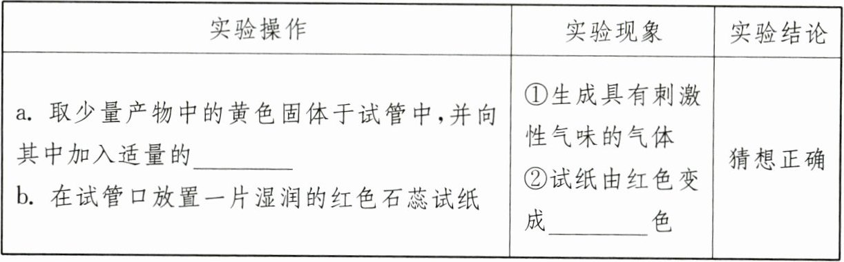 |a. 取少量产物中的黄色固体于试管中,并向其中加入适量的 |①生成具有刺激性气味的气体②试纸由红色变成 色|猜想正确|