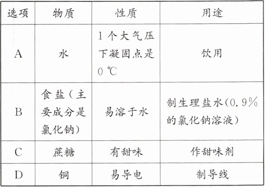 8 教材 P13 练习与应用第 6 题·改编 请仿照实例,观察生活中的物质,任选三种分别写出它们的一个性质和与之对应的用途。