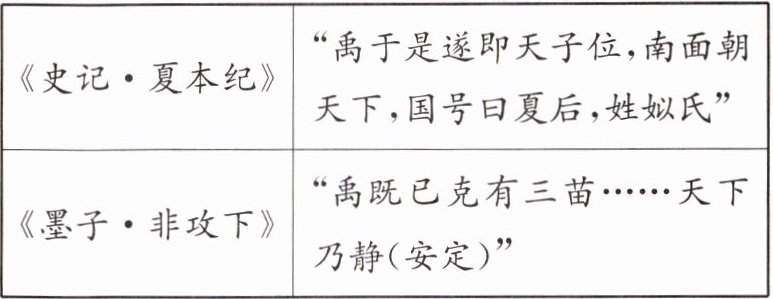 A [解析] 根据材料“禹于是遂即天子位”“国号曰夏后”“禹既已克有三苗”可知,禹建立了夏朝,在继位后,征伐作乱的三苗,稳定统治。因此,通过材料中的文献资料可以了解夏朝的建立和巩固。故选A项。