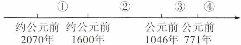 B [解析] 图中②处对应的时间是商朝时期。结合所学知识可知,受战乱、环境变化等因素的影响,商朝曾多次迁都,到商王盘庚时迁徙到殷。故选B项。