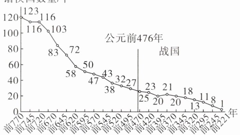 C [解析]根据图片内容并结合所学知识可知,春秋战国时期,诸侯国数量不断减少,这说明经过争霸和兼并战争,不断有弱小国家被强大的国家所吞并,区域内的统一趋势不断加强。故选C项。