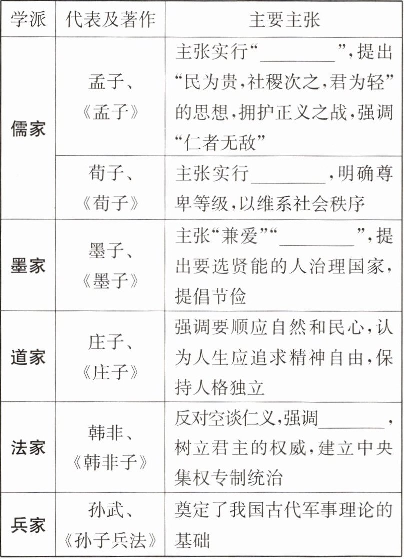 |儒家|孟子、《孟子》|主张实行“______”,提出“民为贵,社稷次之,君为轻”的思想,拥护正义之战,强调“仁者无敌”|
