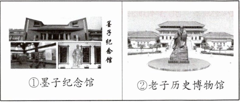 (1)中考新考法 撰写解说词 社团学生按照两位思想家生活时代先后顺序考察纪念馆,顺序应为______。(写序号)根据材料并结合所学知识,参照示例,写出老子历史博物馆对老子的解说。(4 分)