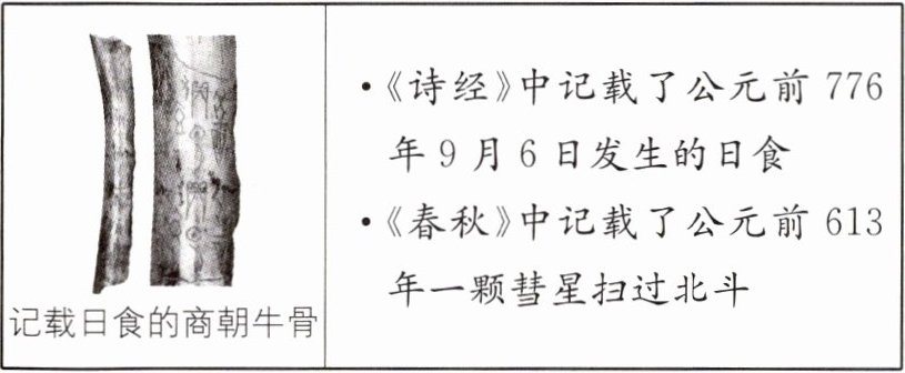 C [解析]根据材料可知,商朝时期,人们已经开始观测日食、月食等天文现象并进行记录;西周时期,人们已经能够识别日食并理解这种天文现象;春秋时期,我国已经有了对彗星的确切记载。这反映出商周时期人们对天文已经有了一定认识。故选C项。