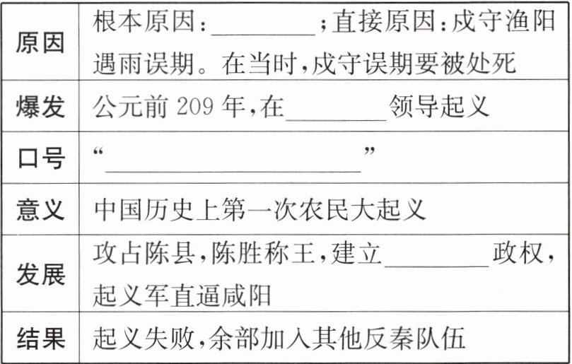 |原因|根本原因:______;直接原因:戍守渔阳遇雨误期。在当时,戍守误期要被处死|