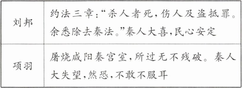 2.A 3.C [解析]根据材料可知,刘邦进入咸阳后约法三章,得到了秦人的支持与拥护,成功收揽了民心;项羽进入咸阳后实施了一系列不得民心的举措,百姓对其大失所望。结合所学知识可知,在楚汉之争中,项羽虽势力强大,但刚愎自用,一味依赖武力;刘邦注重收揽民心,善用人才,力量逐渐由弱变强。最终,刘邦取得了胜利。由此可知,民心得失是成败的重要因素。故选 C 项。