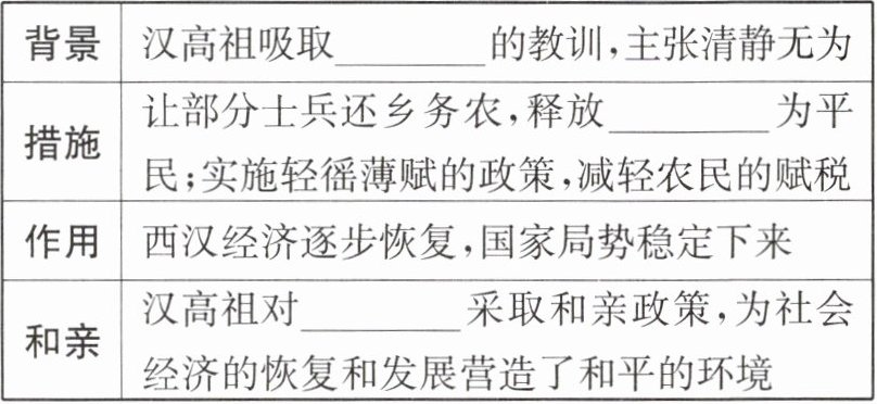 |措施|让部分士兵还乡务农,释放______为平民;实施轻徭薄赋的政策,减轻农民的赋税|