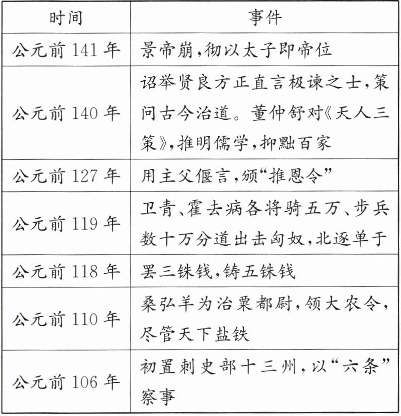(2)政治上,实行“推恩”政策,削弱诸侯王势力;建立刺史制度,加强对地方的监察。经济上,把铸币权收归中央,统一铸造五铢钱;在全国各地设盐铁官,把煮盐、冶铁、卖酒等经营权收归国有,实行盐铁和酒的官营、专卖;在全国范围内统一调配物资,平抑物价;对商人征收车船税。思想上,尊崇儒术。军事上,派卫青、霍去病北击匈奴,使匈奴再无力与西汉对抗。