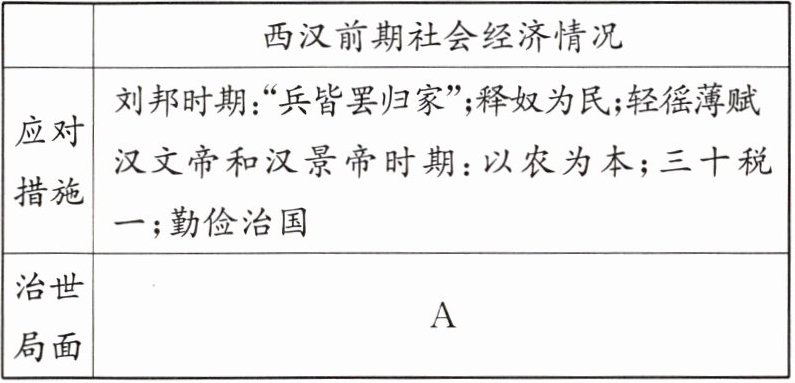 (1)请将 A 处补充完整。根据材料一,简述西汉初期社会的境况。结合所学知识,指出汉初统治者采取的政策。(4 分)