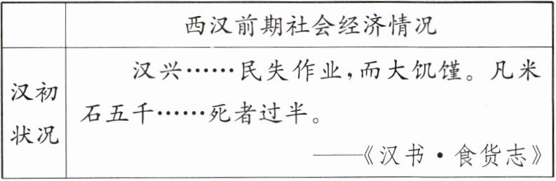 | 汉初状况 | 汉兴……民失作业,而大饥馑。凡米石五千……死者过半。——《汉书·食货志》 |