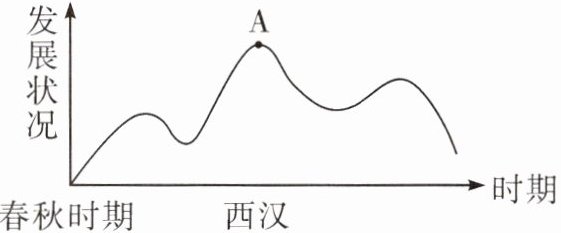 C [解析]观察趋势图可知,A 点对应的时期是西汉。结合所学知识可知,为稳固统治,汉武帝接受董仲舒的建议,把儒家学说立为正统思想,使儒家忠君守礼的思想成为大一统政权的精神支柱。从此,儒学成为国家的统治思想,居于主导地位。故选 C 项。