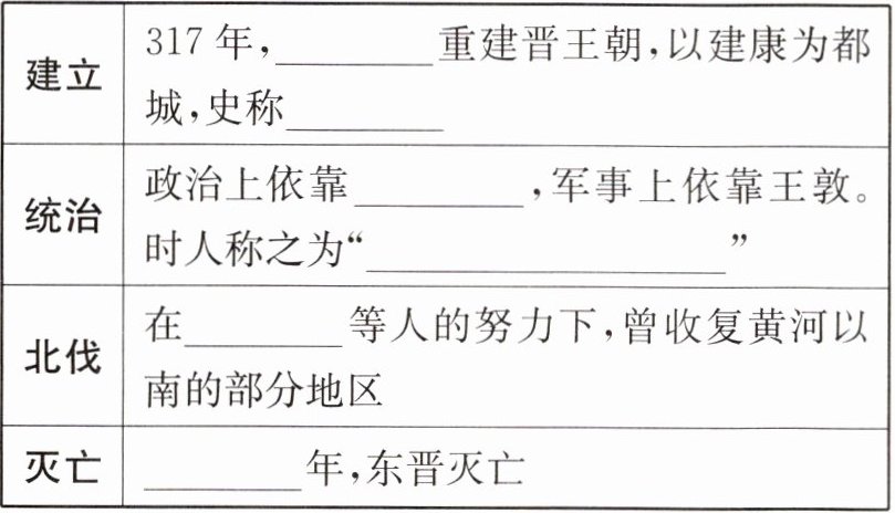 C [解析]结合所学知识可知,316年,西晋灭亡;317年,司马睿重建晋王朝,以建康为都城,史称东晋。故选C项。