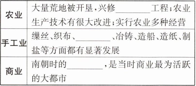 |手工业|缫丝、织布、______、冶铸、造船、造纸、制盐等方面都有显著发展|