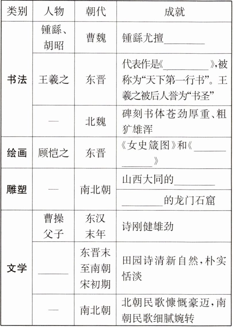 | |王羲之|东晋|代表作是《______》,被称为“天下第一行书”。王羲之被后人誉为“书圣”|
