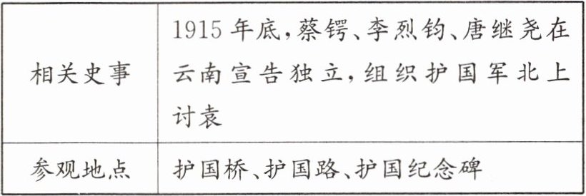 C [解析]结合所学知识可知,对袁世凯的复辟活动,举国哗然。孙中山发表讨袁檄文,号召爱国豪杰共同奋起,维护共和制度。1915年底,蔡锷、李烈钧、唐继尧在云南宣告独立,组织护国军北上讨袁。护国战争爆发。因此,同学们参观的历史文化名城是云南的昆明。故选C项。