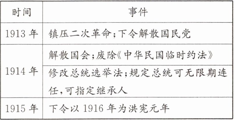 C [解析]根据表格内容可知,“解散国民党”“解散国会”“废除《中华民国临时约法》”“规定总统可无限期连任,可指定继承人”反映了袁世凯实行独裁统治;“洪宪元年”反映了袁世凯企图复辟帝制。故选C项。