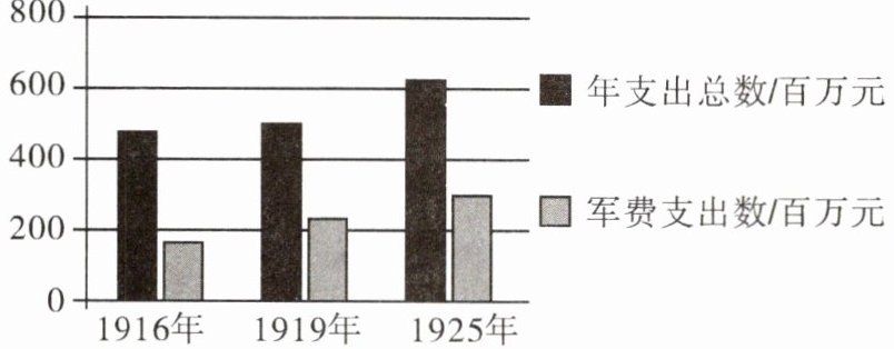 9 跨学科 预算图 如图是1916—1925年北洋政府财政支出预算图。当时军费支出增加是因为( )