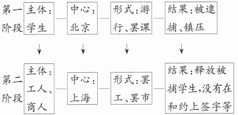 A [解析]根据示意图可知,五四运动由北京青年学生爱国斗争发展为全国工商界联合起来罢工、罢市,这两个阶段体现了五四运动在全国的扩大和各界人民群众参与的广泛性,彰显了人民力量的团结。故选A项。