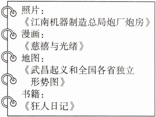 B [解析]根据材料“《江南机器制造总局炮厂厂房》”“《慈禧与光绪》”“《武昌起义和全国各省独立形势图》”“《狂人日记》”可知,材料与洋务运动、戊戌变法、辛亥革命和新文化运动有关,体现了现代化的探索。故选B项。