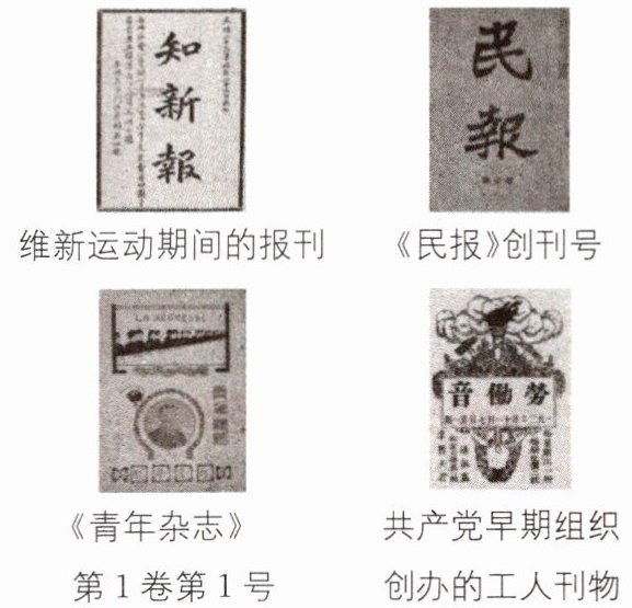 C [解析]根据材料并结合所学知识可知,《知新报》宣传维新变法思想,《民报》宣传资产阶级革命思想,《青年杂志》即后来的《新青年》宣传民主、科学和马克思主义,《劳动音》宣传无产阶级革命思想和马克思主义,它们都是宣传先进思想的载体。故选C项。
